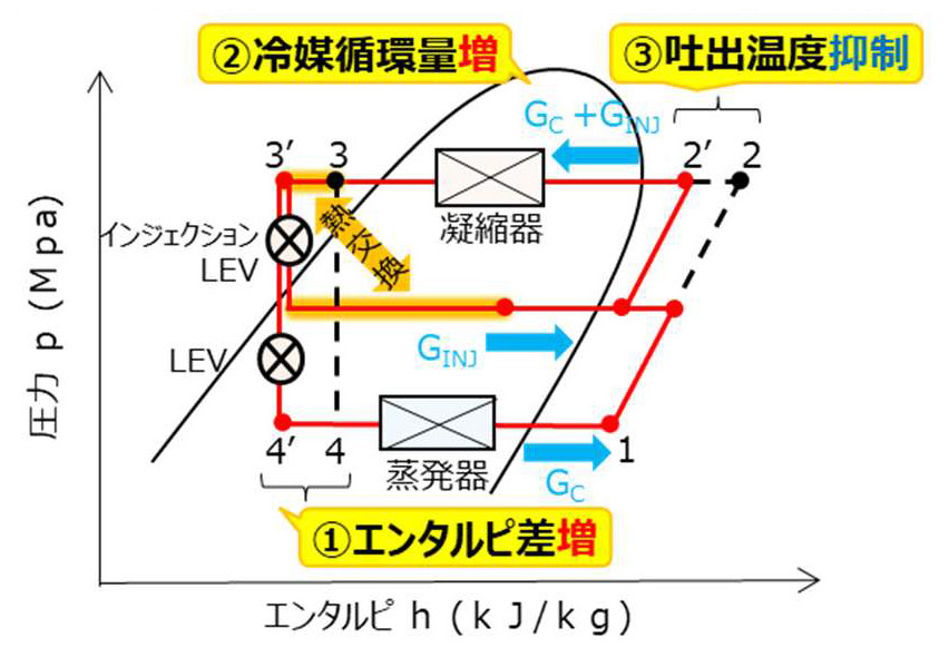 (2) 凝縮器の冷媒循環量増加により暖房能力向上。【図2:GC+GINJ】
