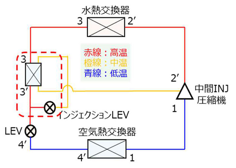 (3) 吐出温度抑制に寄与し、信頼性(故障抑制)も向上。【図2:2→2’】