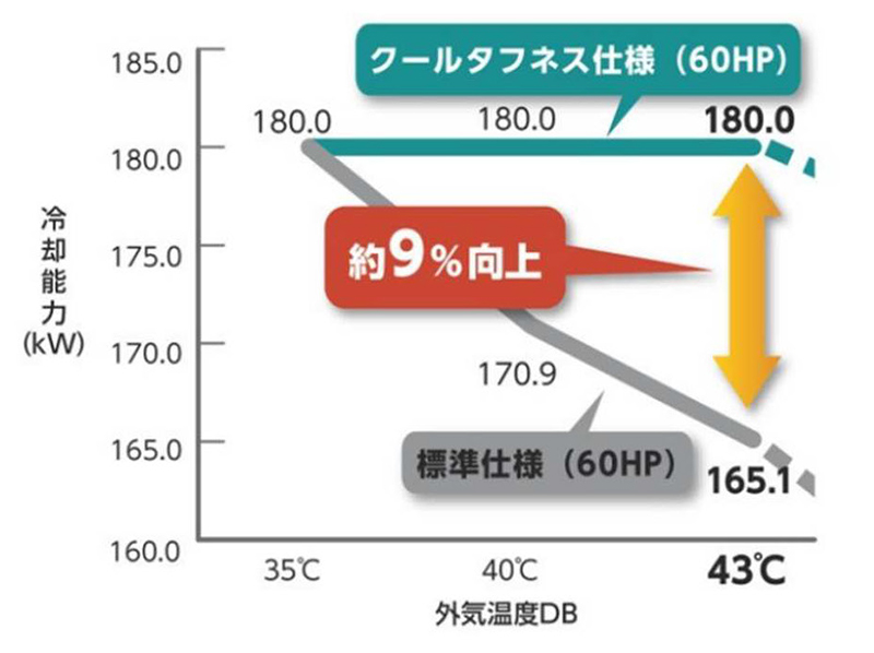 同じく大規模冷却用途を念頭に、業界初10)・業界唯一11) 12)となる「クールタフネス仕様」を開発し、「DT-RⅢ・60 馬力冷房専用機」のオプション仕様として対応している。本オプション仕様では、外気温度43℃まで定格冷却能力(180kW)を維持することが可能となる13)。