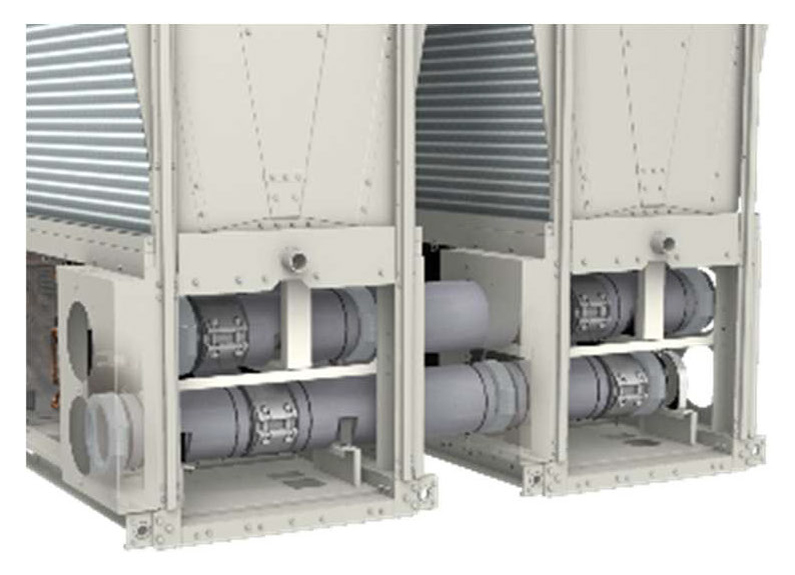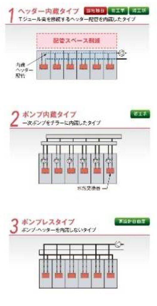 「DT-R」シリーズは3種の配管接続仕様を備えており、その一つであるヘッダー内蔵仕様は、複数台(最大6台)のモジュールを接続するヘッダー配管を機器内に内蔵した当社独自の仕様である。モジュールチラーを複数台連結して運用する場合、ヘッダー配管(集合配管)が必要であり、ヘッダー配管は主に複数箇所からの配管を統合し複数箇所へ冷温水を供給する役割を果たす。さらに通常はモジュールごとに現地水配管と接続する必要があるが、ヘッダー内蔵仕様は最端部のモジュールのみで配管接続が完了し、配管接続箇所数を削減できる。各々の現場の設置条件に対し柔軟に配管仕様を選択可能な点が「DT-R」の強みである。