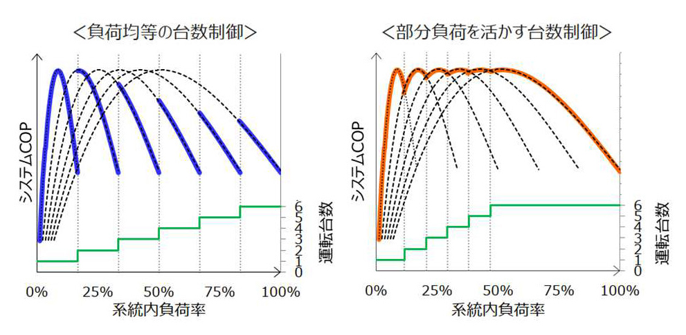 インバータ機の部分負荷特性は、中間容量のCOPが高くなる山なりのカーブとなるが、その特性を考慮した最適な運転台数切替点を演算することで、負荷に対し均等に台数切替させる場合(図7 左側)に比較して平均的な運転COPの向上が可能となる。(図7 右側)