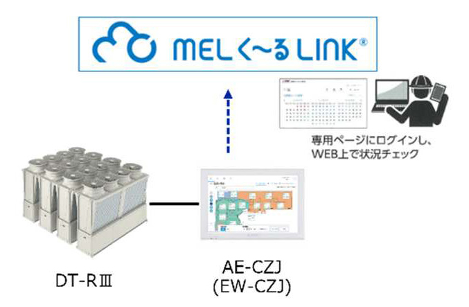 当社はクラウドを活用した常時遠隔監視システム「MEL く~るLINK」を営業展開している。本サービスは、業務用空調冷熱製品向けの機能として、①異常通知、②運転データ確認、③遠隔冷媒漏えい診断を備えており (※「DT-RⅣ」は発売後に順次対応予定)、異常情報を早期把握・迅速な復旧と、点検業務の省人・省力化を実現し、現場運用の効率性および安全性の向上に資するサービスである。